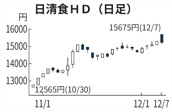7日の東京株式市場で日清食品ホールディングス(HD)株が一時前日比410円(3%)高い1万5675円まで上昇し、上場来高値を更新した。前日に株式分割を発表したことで、投資家の裾野が広がるとの期待が高まった。海外事業が需要の増加を受けて引き続き好調に推移するとの見方も株価の支えとなった。